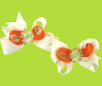 Set of two hair clips that coordinates well with the Maple design by Jelly the Pug. Cream and orange bows centered with a green sequin decorated flower.