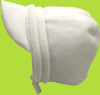 Bonnet has ties and is made of 100% polyester fleece. Lining is 65% polyester, 35% cotton.
