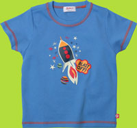 This handsome t-shirt is made of 100% cotton. It features a "Rocket" screen print that coordinates great with the Navy Multistripe Tie Waist Pants and Cargo shorts, and the Sputnik Cargo Shorts.