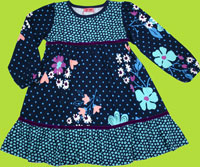 Beautiful midnight blue dress with dots and flowers in blues, purples and pink. Made of 100% cotton.