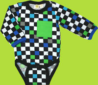 This fun checker box onesie is made of 95% cotton and 5% spandex.