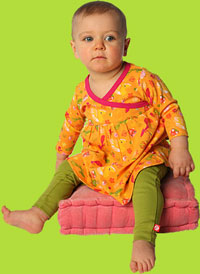 This soft cotton dress coordinates great with the solid Orange, Yellow, Mandarin, Moss and Fuchsia colors from the Baby Basics line as well as Fuchsia and Mandarin French Cotton Terry.