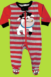 100% Interlock Cotton. Machine/Wash Dry. Richly Detailed Applique & Embroidery. Full Zip Front with Snap Tab Closure. Anti Skid Pattern on Feet.