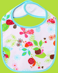 This 100% Cotton Bib is lined with Cotton Terry and is trimmed in bright Cotton Interlock. Velcro patches fasten the bib around baby's neck.
