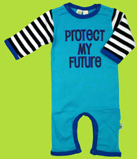 This bright teal bodysuit with an important message has fun striped sleeves and royal piping. Made of 100% organic cotton.