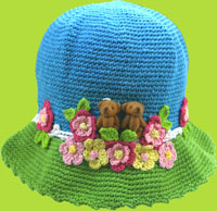 This sweet hat is decorated with pink and yellow hand crocheted flowers and two adorable brown teddy bears. It is hand crocheted of 100% cotton.