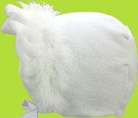 This adorable bonnet is sure to keep your baby's head warm and cozy. It has a ruffle brim and is edged with pink marabou feathers. It is made of 100% polyester and lined with 100% cotton.