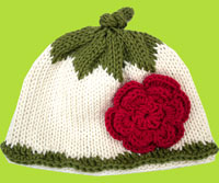 Hand Knit Baby Hat Ivory with Green Top and Flower