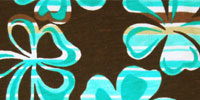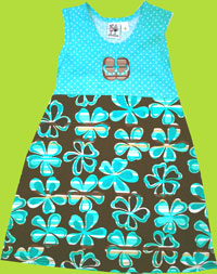 This dress is made in the U.S.A. of 100% cotton. Top part is aqua with white polka dots and have a cute flip flop appliquet. Skirt is brown with turquoise and aqua striped flowers.
