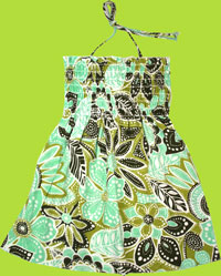 This adorable dress in greens, aqua and white is made in the U.S.A. of 100% cotton. The top is smocked for a perfect fit. The dress ties around the neck.