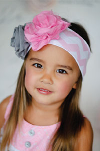 Adorable knit headband in Pink and White Chevron Stripe decorated with a Pink and a Grey Tulle Flower. 95% cotton, 5% spandex.