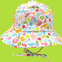 This wonderful hat with ties is made of 100% cotton and gives great sun protection. With a sweet sherbert color palette of lime, fuchsia, pinks, pool and orange it is sure to delight little girls.
