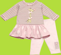 This sweet dress set in light pink with chocolate stripes has a precious giraffe with a flower in her mouth on the front, and a ruffle neck and cuff line. The solid pink leggings have an embroidered flower on the ankle. Dress made of 95% cotton and 5% spandex. Leggings made of 100% cotton.