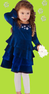 This midnight blue velour dress is perfect for your Snow Princess with its beaded and embroidered snowflakes on the chest, bell cuffs and a tiered skirt. Pair with the Le Top "Starry Night" Silver Glitter Footless Tights to complete this winter look. Made of 80% cotton and 20% polyester. Imported.