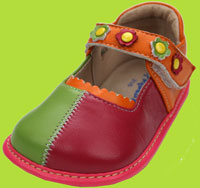 These adorable shoes make a cute litte squeak everytime your little one takes a step! Squeaky tube is removable from the sole of the shoe. These shoes are made of luxurious, butter soft leather with pigskin leather lining and padded collars. The soles are made with rubber and are very flexible and durable. The Three Colors are Respberry, Green and Orange.