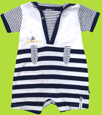 This super fun nautical inspired shortall in navy and white stripes has a hood and a cute little boat with stars screen print that reads "My little hero". Snap crotch and collar. Made of 100% cotton. Imported.