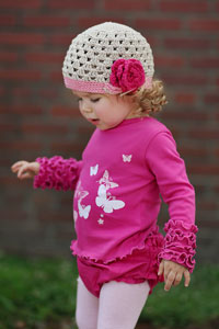 Adding even more ruffles, your loved little angel will look absolutely precious in this long-sleeved ruffled tee. Embellished with playful glitter paint butterflies across the front, this tee is also accented with a feminine key-hole back and single button. Made of our new interlock knit in 100% cotton, it matches perfectly with our knit fuchsia ruffled Crawlers. The pink & white butterflies are done in both solid and glitter paint for an extra fun flair! This is a sweet outfit that is simple & fun!
