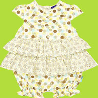 Adorable bubble with tiered ruffle and snaps for convenient diaper changes. Made of 95% cotton, 5% spandex.