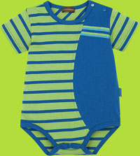 Shades of vibrant meadow green and deep blues in a fun striped and color-blocked pattern define this comfy cotton short sleeve bodysuit. Pieced horizontal stripes meet with a sweeping deep blue curve to create a perfect layering piece with pants for a tucked-in look. Sport shoulder and underneath snaps assist dressing. Made of 100% cotton. Imported.