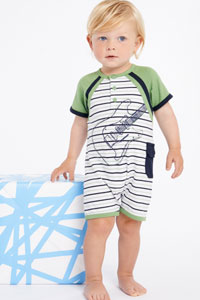 This soft one-piece mixes interchanging navy and green stripes with olive green slubbed cotton raglan short sleeves to create a comfy and functional look. Soft rib neckline opens up with button henley style, navy cargo side pocket and distressed electric guitar graphic add style. Underneath diaper snaps make dressing easy. Made of 100% combed cotton. Machine washable.