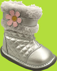 Silver is in this season, and this silver quilted pansy boot is as good as it can be. This comfy, pretty boot is topped with a band of soft faux fur that little ones just love! Vinyl upper and rubber sole. MEASURING: With your child standing, measure from back of heel to tip of longest toe. Add 1/2 inch for socks when selecting the correct size. Measure every 3 months during the first year and every 4 months thereafter.