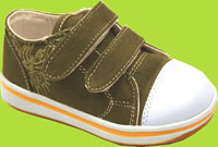 These tennis shoes are a rich slate color with light green tattoo and velcro closure. These shoes will be a great hit with your child. Each shoe squeaks when the child walks correctly heel to toe. When quiet time arrives, the squeaker, located in the heel, can be pulled out by an adult. MEASURING: With your child standing, measure from back of heel to tip of longest toe. Add 1/2 inch for socks when selecting the correct size. Measure every 3 months during the first year and every 4 months thereafter.