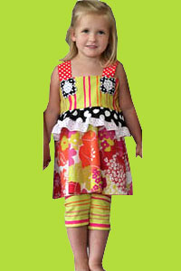 This fun and funky floral/stripe mix set in lime, pink, orange, black and white is truly fun and unique. The red straps have white polka dots and a flower applique with a lime green button in the center. The skirt is floral and has a black and white polka dot tier on top. Striped Capri Leggings. Upper made of 98% acrylic and 2% elastane, 100% cotton, skirt is 67% polyester and 33% cotton, ruffles are 100% cotton, 55% cotton and 45% polyester, pants are 98% acrylic and 2% elastane. Imported.