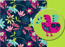 Zutanos new floral is composed of fresh fuchsia, pool and lime hues with a darling navy background that makes for a completely new print. Like taking a stroll through a moonlit garden replete with an array of exotic tropical flowers and fabulous scents, Moonflower is a treat for the senses. Its interesting paper cut-out styling gives it a crafty feel and it pairs very well with a variety of French Terry Solids and the new Midnight Stripe. A fun, free-form owl is featured on the screen tee, and it is easy to imagine her mysterious hoots echoing at midst the Moonflower grove.
