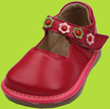 Red Squeaky Daisy Mary Jane Reg. $30.95, SALE $15.00 These summer red maryjanes have pretty white daisies planted on the toe and strap. Each shoe squeaks when the child walks correctly heel to toe. Available in sizes 3, and 10. |