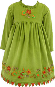 Beautiful Petal Hem Dress in Cotton Corduroy with Appliques and Embroideries. Dress ties in the back for a perfect fit. 100% cotton.