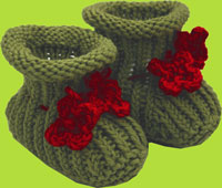 Moss Green Hand Knit Baby Booties w/Red Flowers