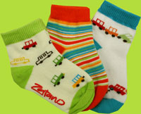 One pair of cream socks with Clunker cars, One pair of colorful stripes in orange, pool, lime, white and red, and one pair of white with colorful clunkers. Made of 69% cotton, 25% nylon, 2% spandex, 1% rubber (non skid), 3% other fibers.