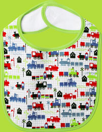 This 100% Cotton Bib is lined with Cotton Terry and is trimmed in bright Cotton Interlock. Velcro patches fasten the bib around baby's neck.